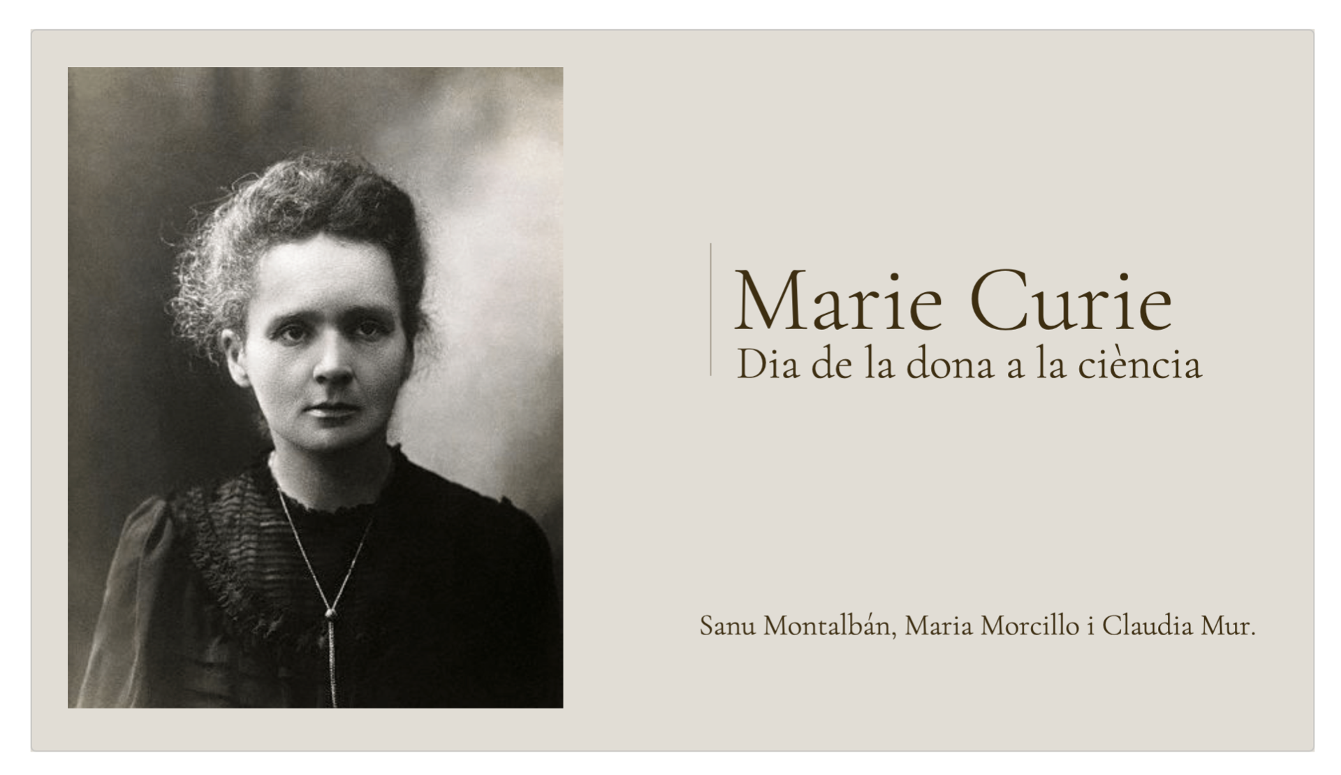 En diciembre de 2021 nuestra profesora de química nos propuso la idea de realizar una exposición a los alumnos y alumnas de 2º de la ESO sobre Marie Curie para conmemorar el día internacional de la mujer y la niña en la ciencia.